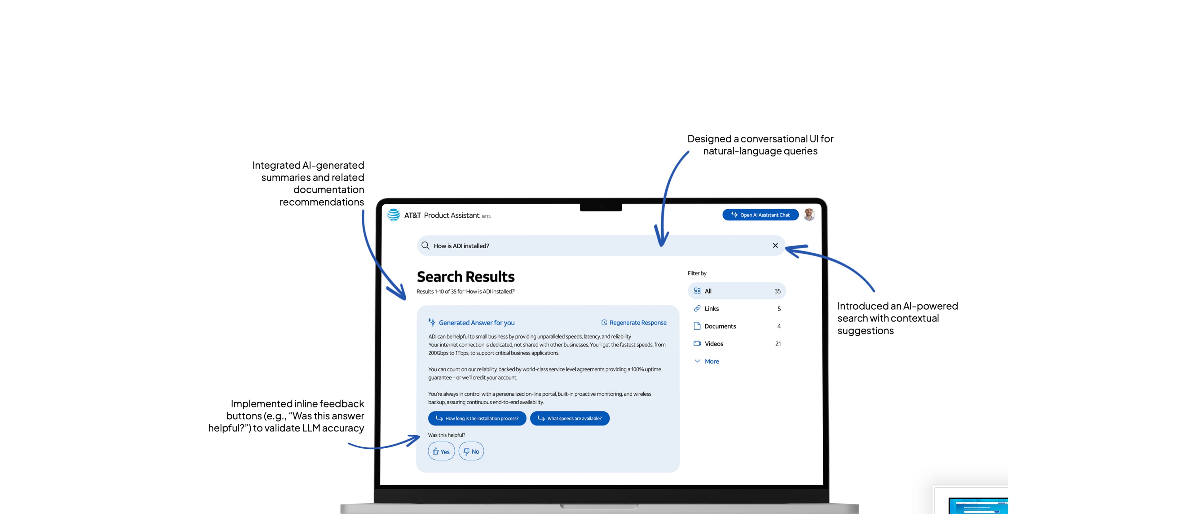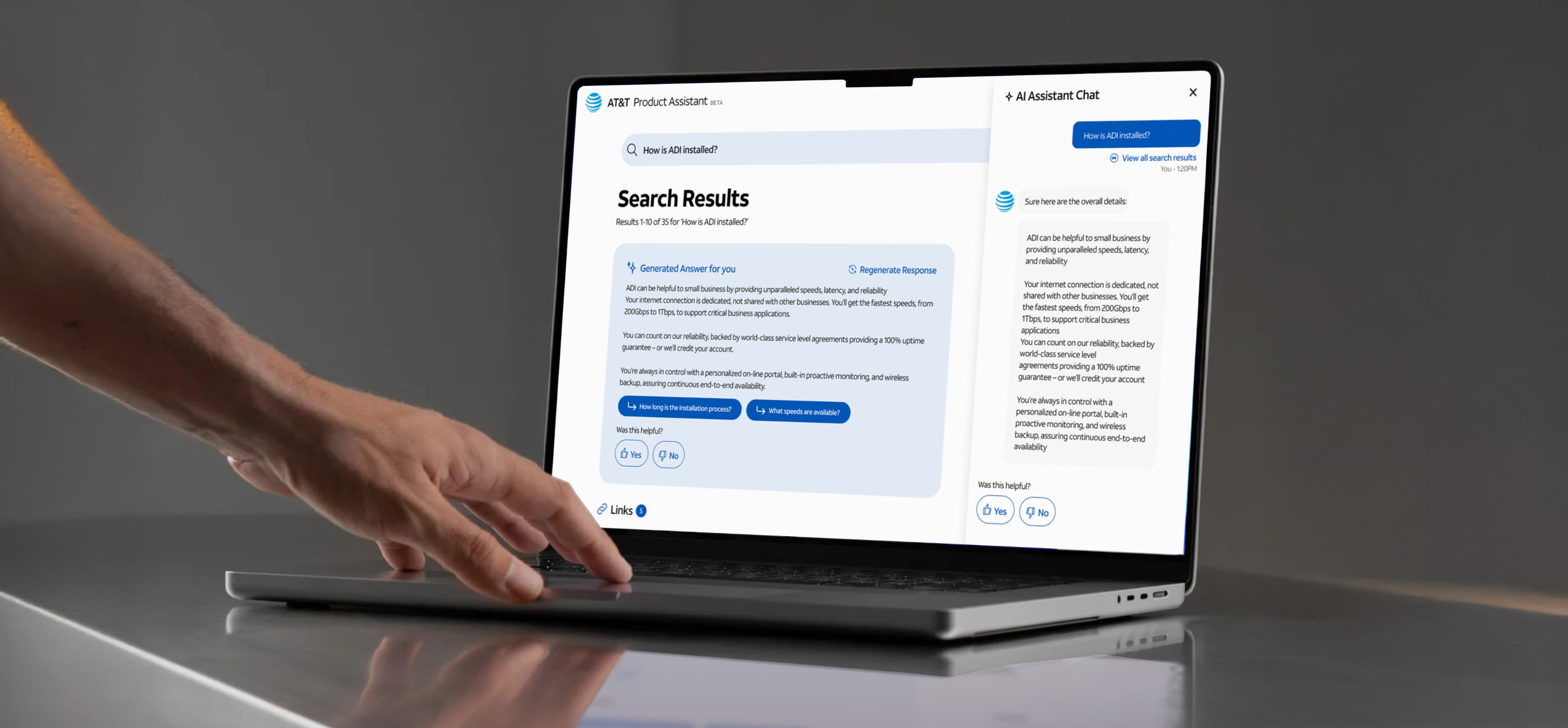 The system responds with contextual answers, in-document summaries, and related recommendations—all within two clicks.
